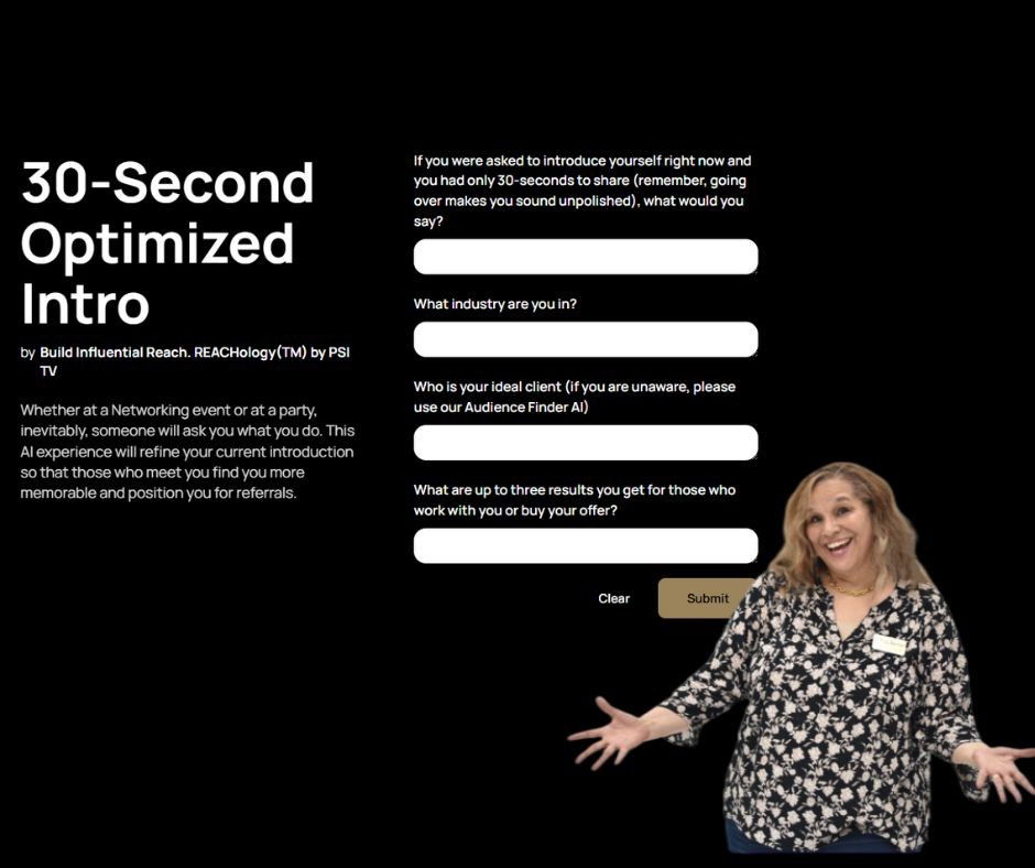 This AI tool ingests your responses to specific questions to generate an optimized 30-second personal introduction, perfect for use at networking events, as a byline for publications, or for show Hosts to quickly introduce you to their audience.